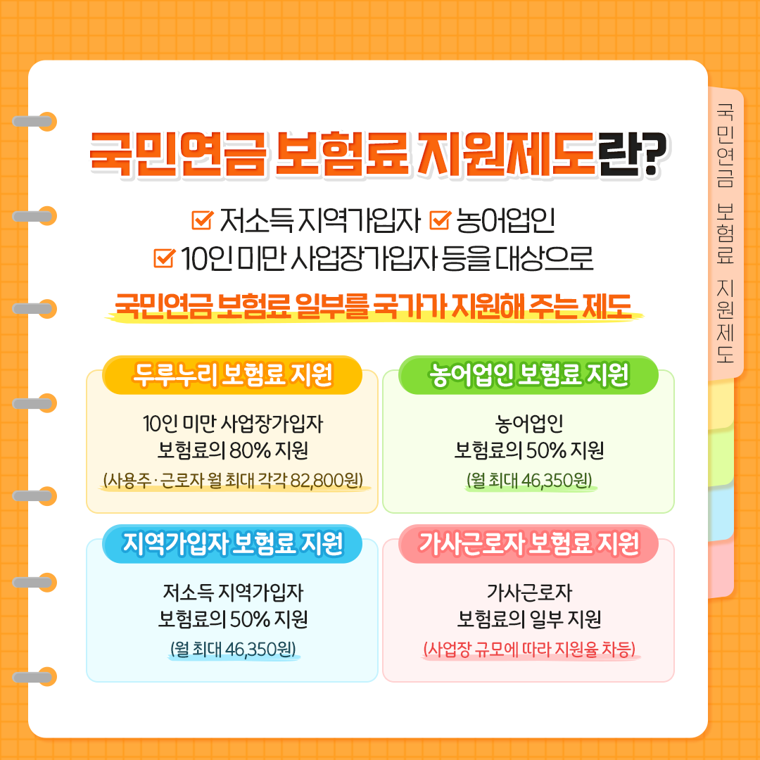 저소득지역가입자, 농어업인, 10인 미만 사업자 가입자 등을 대상으로 국민연금 보험료 일부를 국가가 지원해 주는 제도입니다.